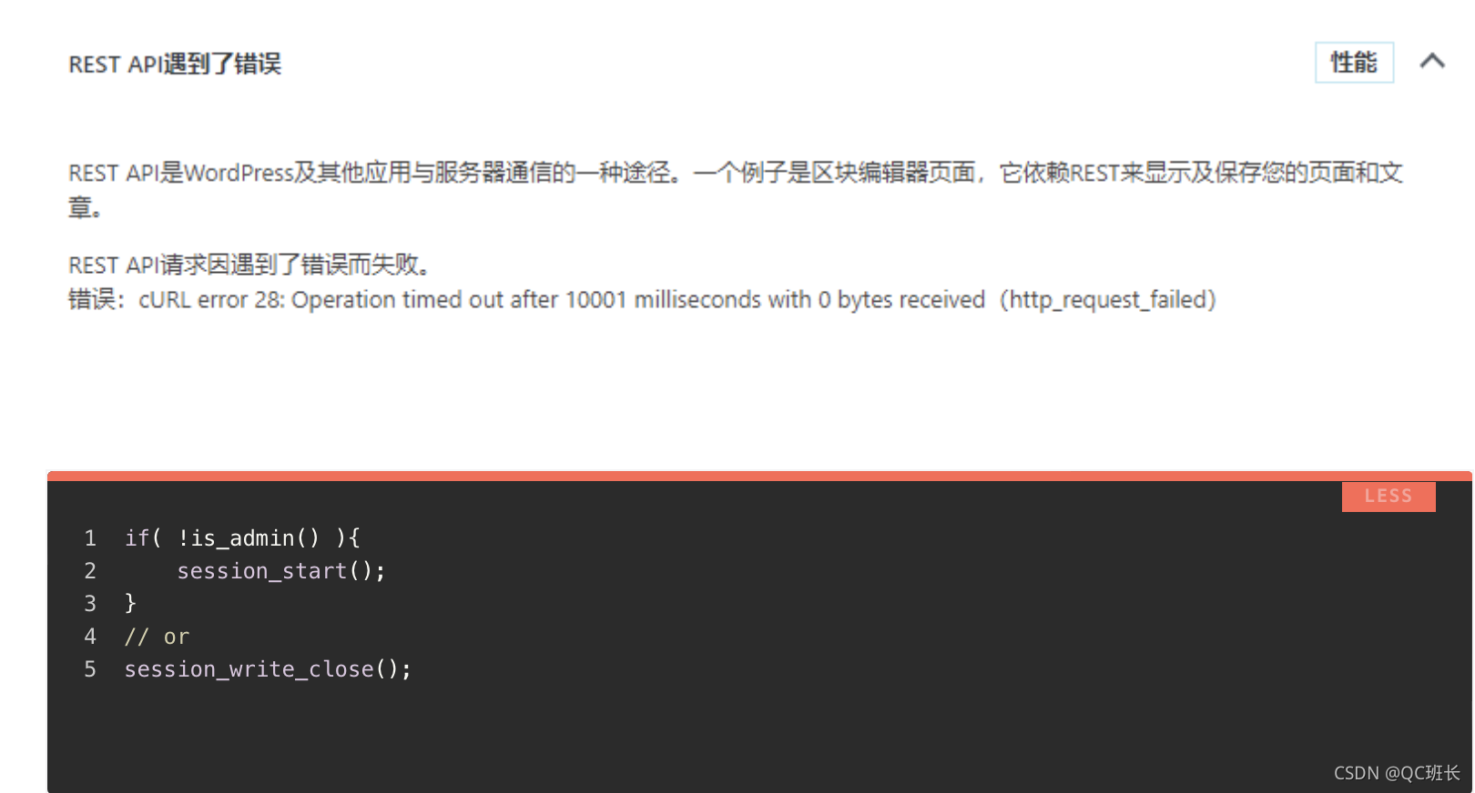 session_start()函数调用生成了一个PHP会话。该会话干扰了REST API及环回请求。在做出任何HTTP请求前,该会话必须由session_write_close()函数关闭。REST API遇到了错误性能