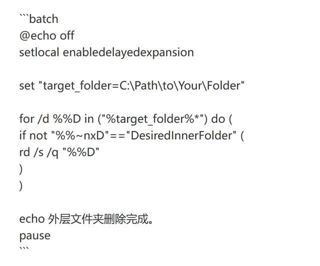 如果你需要批量删除多个外层文件夹,那么使用批处理脚本将是一个更高效的选择。通过编写一个简单的批处理脚本,你可以轻松地一次性删除多个外层文件夹。