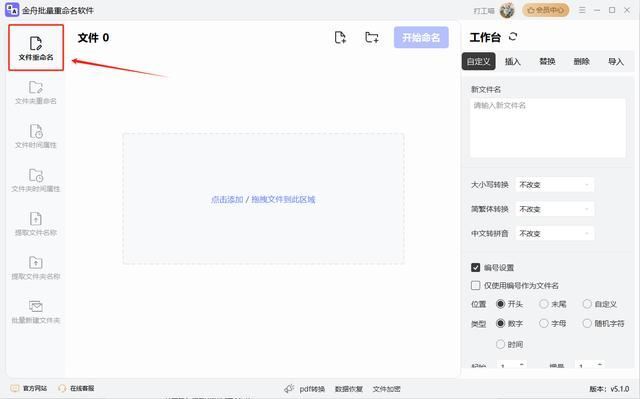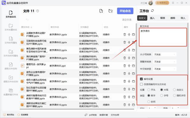 步骤二:添加需要批量重命名的文件后,在右侧工作台可以输入新文件名称,还可以对进行编号设置,如:位置和类型等,根据自己需要设置;