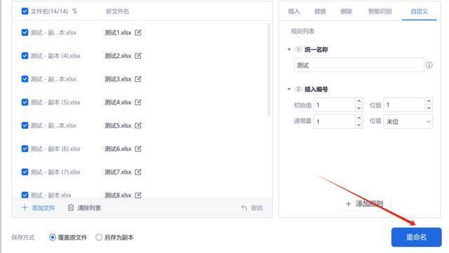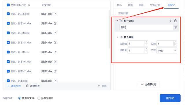 - 直接重命名成指定文本,支持重命名后统一变成英文大写字符、英文小写字符。
