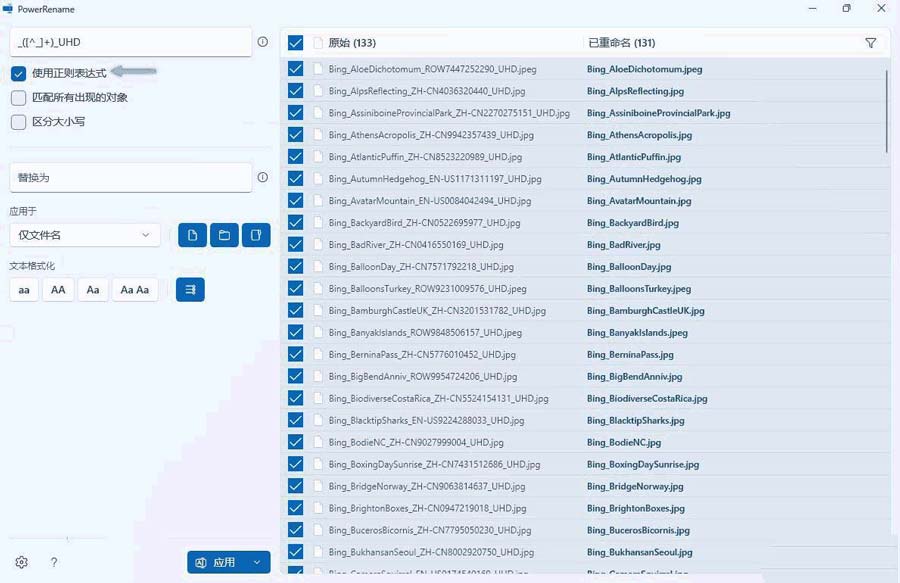 2)勾选「使用正则表达式」并在「搜索」框中输入_([^_]+)_UHD,查找第二个以_开头,以UHD结尾的部分,并替换为空,即删除该部分。然后点击「应用」。