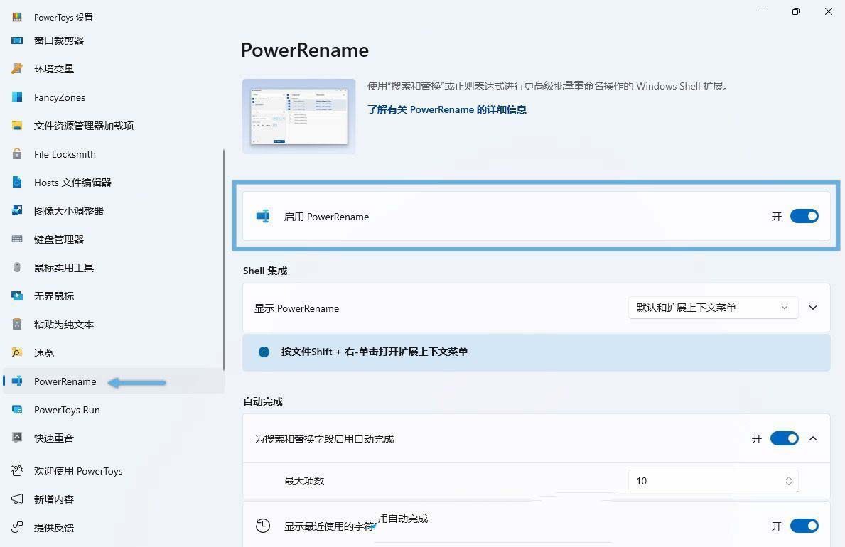 2. 打开 PowerToys 设置,在左侧菜单中选择「PowerRename」,打开「启用 PowerRename」开关。