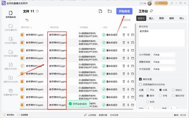 步骤三:设置完成,点击开始命名,文件命名成功后,可以看到命名后的新文件名。