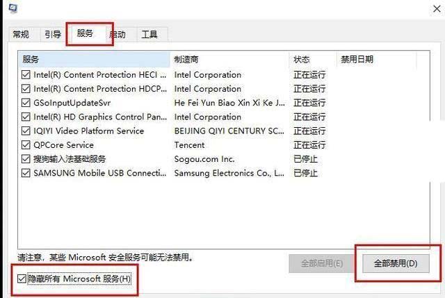 2. 点击“服务”勾选“隐藏所有Microsoft服务”,对于第三方软件服务,全部进行勾选。(注意不要勾选系统服务,不然可能会影响系统正常运行)之后点击“全部禁用”。
