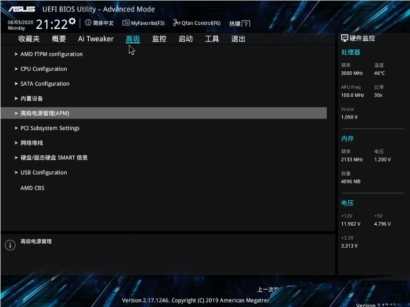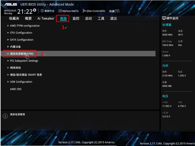 以华硕主板UEFI BIOS为例,将BIOS的语言改为中文(简体),按键盘上的 F7 键,或者选择 Advanced Mode 进入高级模式设置。进入高级模式后,将菜单切换到高级,在高级下,点击高级电源管理,在高级电源管理菜单下,点击断电恢复后电源状态后面的下拉选项,选择电源开启。完成设置后,按键盘上的 F10 键,保存并退出。