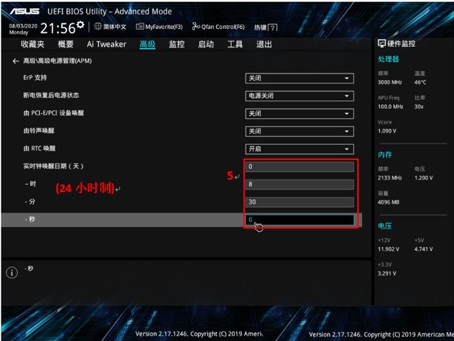 5、设置电脑自动开机的时间,举例:如果需要每天早上八点三十分自动开机,设置如下: