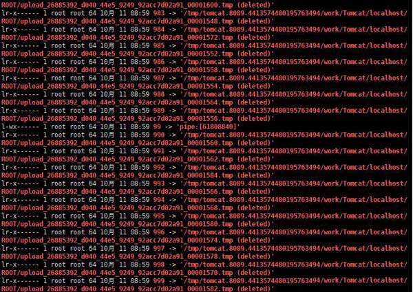 3、由于tmp为临时文件夹,文件使用结束后自动删除,猜测存在文件被删除但是空间未释放的情况。通过 lsof /tmp 查看文件情况,发现有大量的文件被删除但是依旧被进程占用,导致无法释放空间。