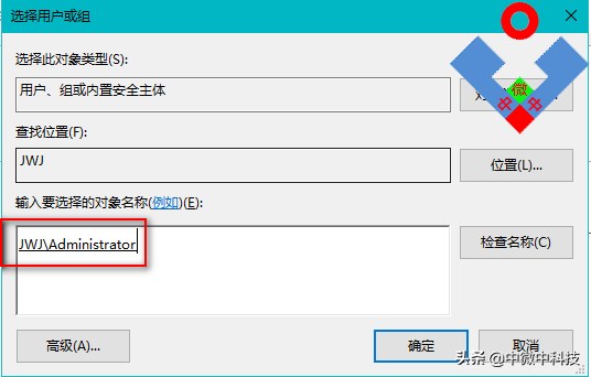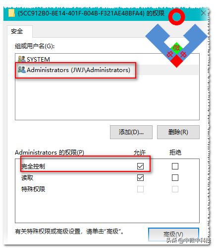 第二步:红圈处显示没有“完全控制”权,此时点击右下角的“高级” ↓