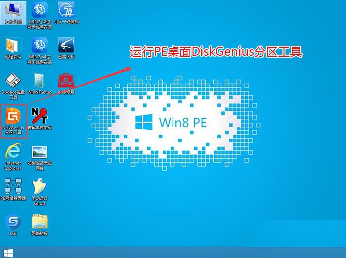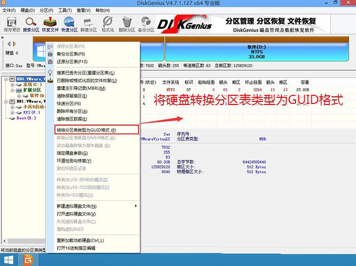1、选择小兵U盘启动盘进入PE后,在桌面上运行DiskGenius分区工具,点击菜单栏的【硬盘】,选择【转换分区表类型为guid格式】,然后保存更改,如下图所示;
