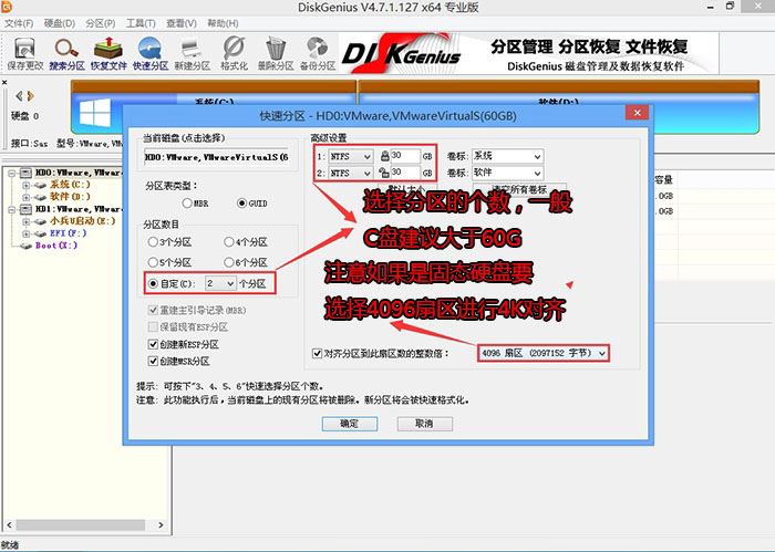 3、在弹出的【快速分区】界面,我们这里选择好分区的类型GUID和分区的个数以及大小,这里一般推荐C盘大小大于60G比较好,然后注意如果是固态硬盘要进行4K对齐,如下图所示;