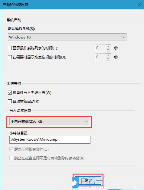 启动和故障恢复窗口中,写入调试信息 – 选择“小内存转储(256KB)”,路径选择默认,勾选将事写入系统日志,确定并重启电脑;