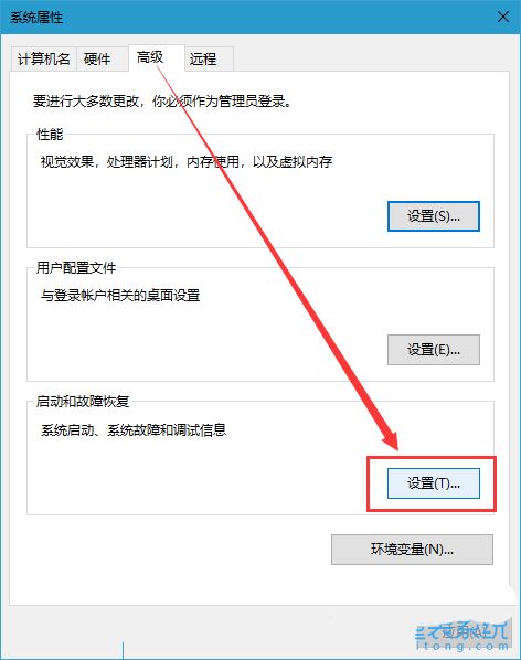 桌面右键点击此电脑,在打开的菜单项中,选择属性,系统属性窗口中,切换到高级选项卡,然后点击下方的启动和故障回复 – 设置;