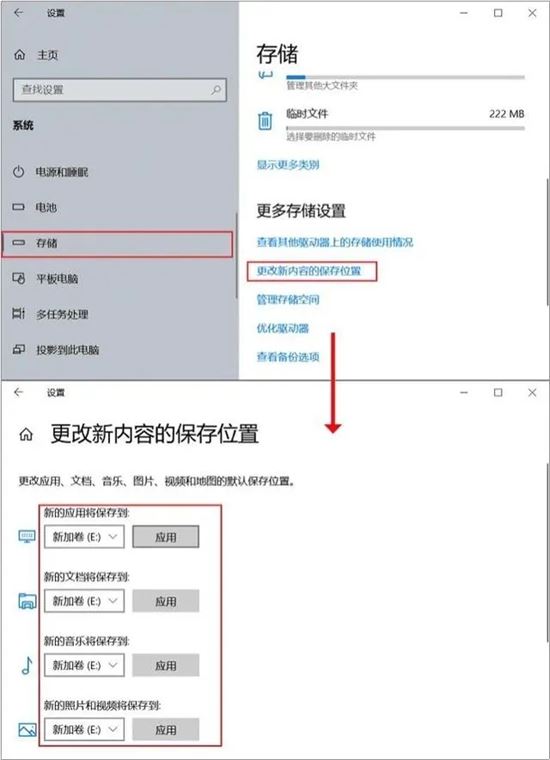 在【存储】的界面,下拉右侧页面找到“更改新内容的保存位置”这行小字,点击进入。在新页面中更改电脑的应用、文档、音乐、图片、视频和地图的默认保存位置,依次把下列的本地磁盘更改成C盘以外的磁盘并依次点击“应用”。
