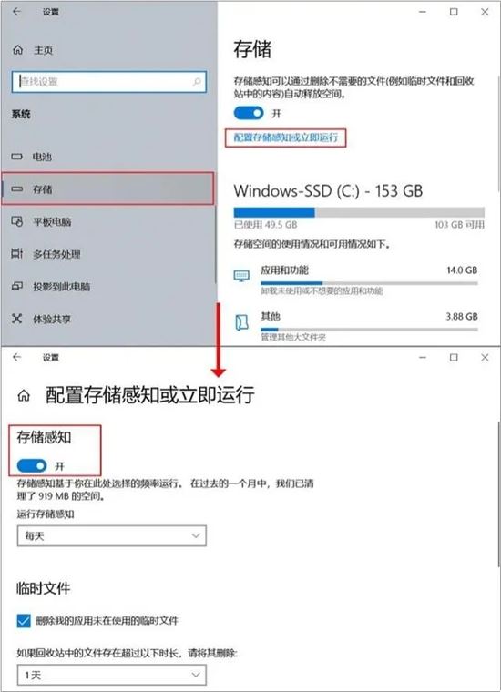 依次点击电脑的【开始】—【设置】—【系统】,在“系统”下的菜单栏中选中【存储】,在右侧找到“配置存储感知或立即运行”这行小字,并点击进入。在出现的新页面中,直接把“存储感知”下的开关打开。