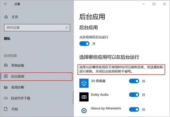 依次点击电脑的【开始】—【设置】—【隐私】,在“隐私”菜单栏下拉找到“后台应用”,接下来就可以在页面右侧把一些不使用的后台应用关闭了。