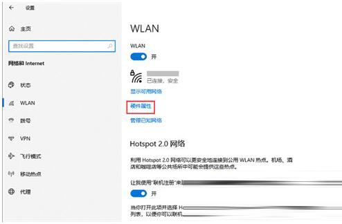 2.打开“网络和internet”设置,点击“硬件属性”,打开"WLAN“窗口;