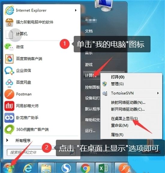 同样是打开【开始菜单】,找到【我的电脑】图标。不同的是,鼠标右键【我的电脑】图标,在弹出的窗口,点击【在桌面上显示】。点击成功,就可以在电脑桌面上看到消失的电脑图标了。