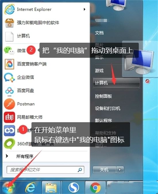 打开电脑的【开始菜单】,在里面找到【我的电脑】图标,或者【计算机】图标。找到后,用鼠标把这个图标拖动到电脑桌面上。
