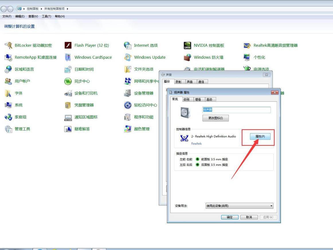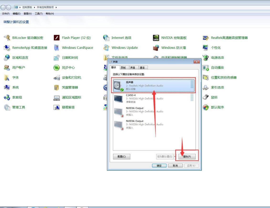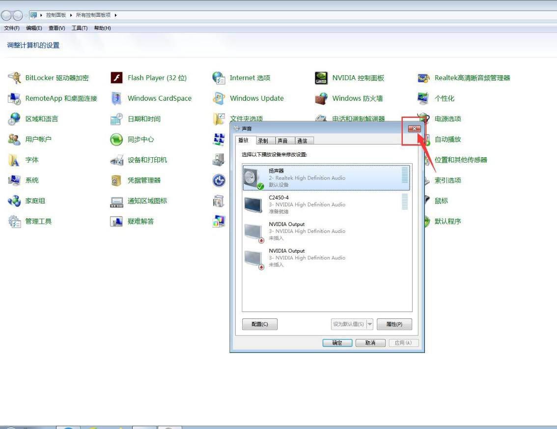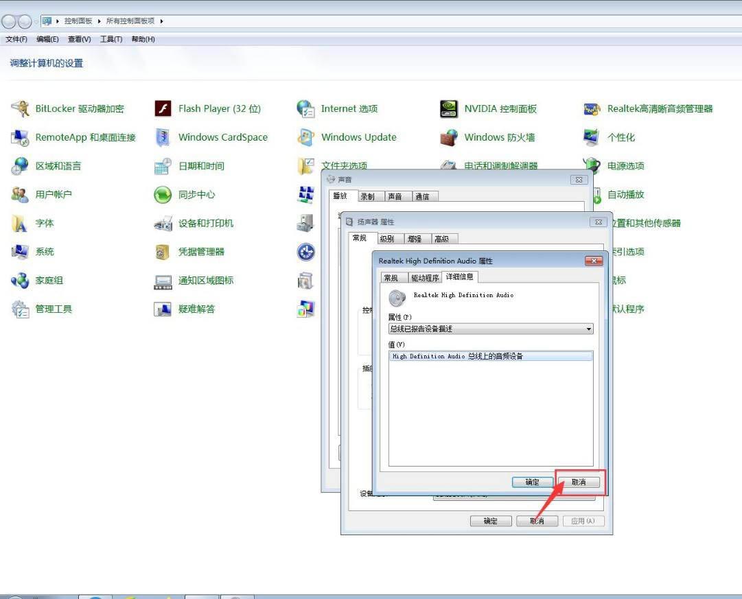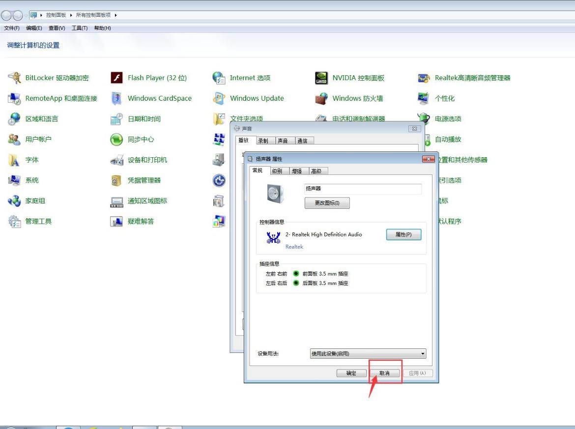 接下来,我们会返回到扬声器属性设置界面,此时,我们点击下方的【取消】按钮,此时,我们会返回到声音设置界面,此时,我们点击右上角的【关闭】按钮即可。