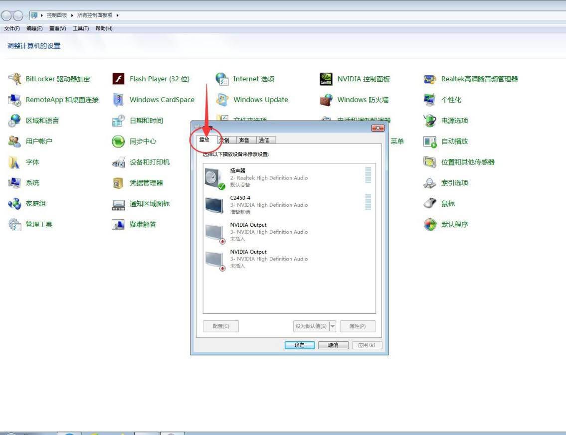 接下来,在进入进入声音设置界面后,这时,我们点击上方菜单栏中的【播放】选项卡,进入播放选项卡设置界面;