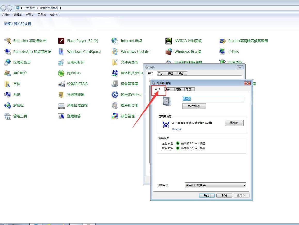 接下来,在进入到扬声器属性设置界面后,此时,我们点击上方菜单栏中的【常规】选项卡;