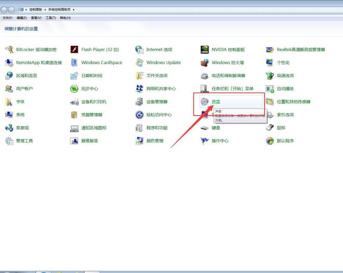 接下来,在进入控制面板主界面后,此时,我们点击打开【声音】,进入声音设置界面;