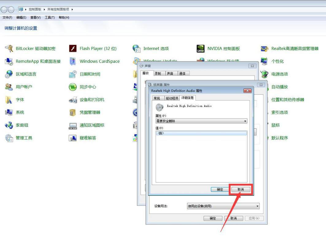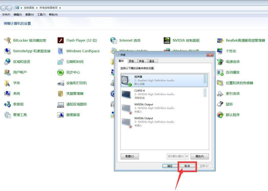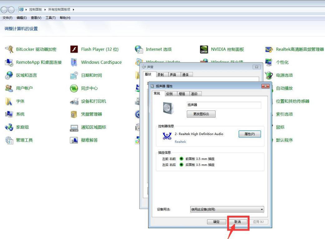最后,我们会返回到扬声器属性设置界面,此时,我们点击下方的【取消】按钮,此时,我们会返回到声音设置界面,此时,我们继续点击下方的【取消】按钮即可。