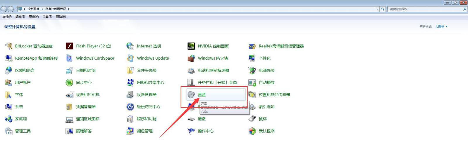 接下来,在进入控制面板主界面后,此时,我们点击打开【声音】,进入声音设置界面;