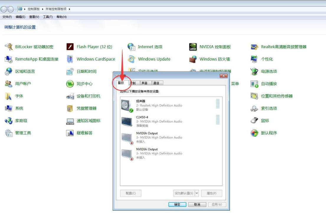 然后,在我们进入进入声音设置界面后,此时,我们点击上方菜单栏中的【播放】选项卡,进入播放选项卡设置界面;