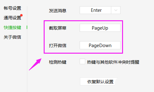 6、在微信快捷键界面,我们也可以将PageUp和PageDown搭配其他键设置快捷键,如图。