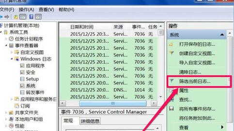 因为“Windows日志”记录很多的事件,如果查看所有日志,肯定太多了,必须先筛选一下,到“系统”这一项右边的窗口,选择“筛选当前日志…”。