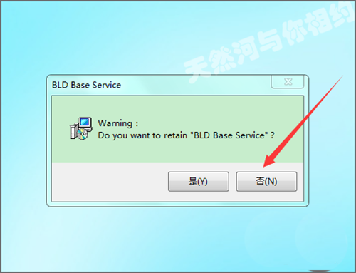 4、打开这个卸载程序之后,它会弹出一个警告的界面。对于一些朋友来说,通常在进行卸载软件的时候,我们大多数情况下会选择是。而在这个界面中它提示的是你要保留这个BLD Base Sevice?我们选择否。如果选择了是这个程序就不会进行卸载,还是在电脑中。