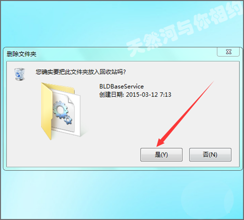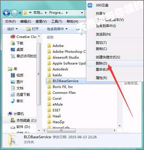 10、这时候,在列表中选中BLDBaseService的文件夹,然后点击右键,在下拉列表中选择删除。接着在弹出的删除文件夹的面板中选择是,这个文件就被我们进行了删除。